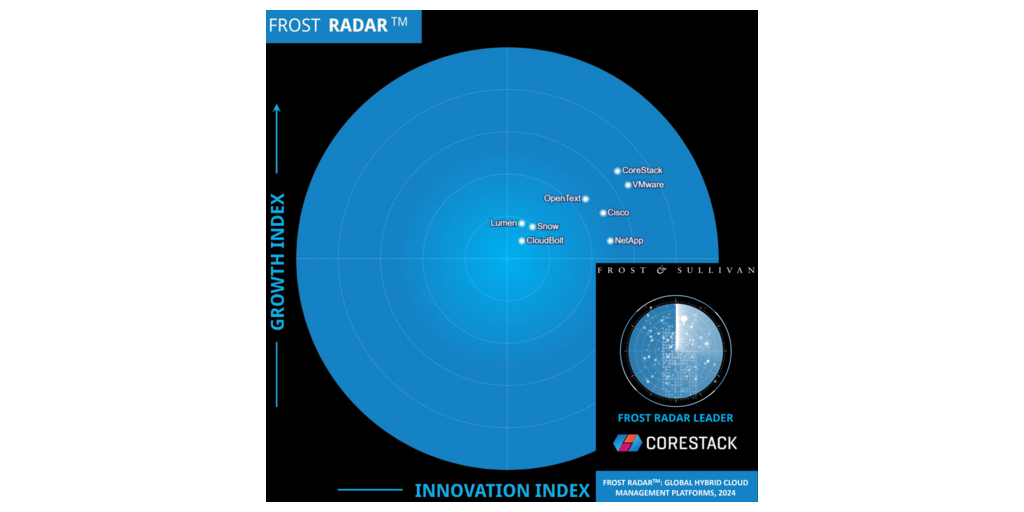 "Earning the position of a Leader in Frost & Sullivan's Global Hybrid Cloud Management Frost Radar is a testament to CoreStack's unwavering commitment to pushing the boundaries of cloud governance," said CoreStack CEO Ez Natarajan. "Our journey has been marked by a relentless pursuit of excellence and a dedication to providing organizations with innovations, such as our recently launched CR360 cloud governance platform, which integrates all aspects of cloud management. This recognition is not just a reflection of our past achievements but a promise of our continued commitment to innovation and delivering value to our clients."