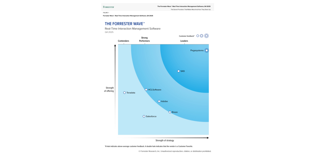 According to the Forrester report, “Reference customers universally recounted using Pega for consistent real-time decisions across digital and human-assisted channels, with strong adoption for marketing, sales, and service use cases. They boasted significant uplift in both engagement and efficiency, praised Pega’s flexibility and transparency, and articulated plans to use Pega Customer Engagement Blueprint to accelerate ideation, scale personalization, and help navigate the solution’s complexity. Pegasystems is a Customer Favorite in this evaluation.”