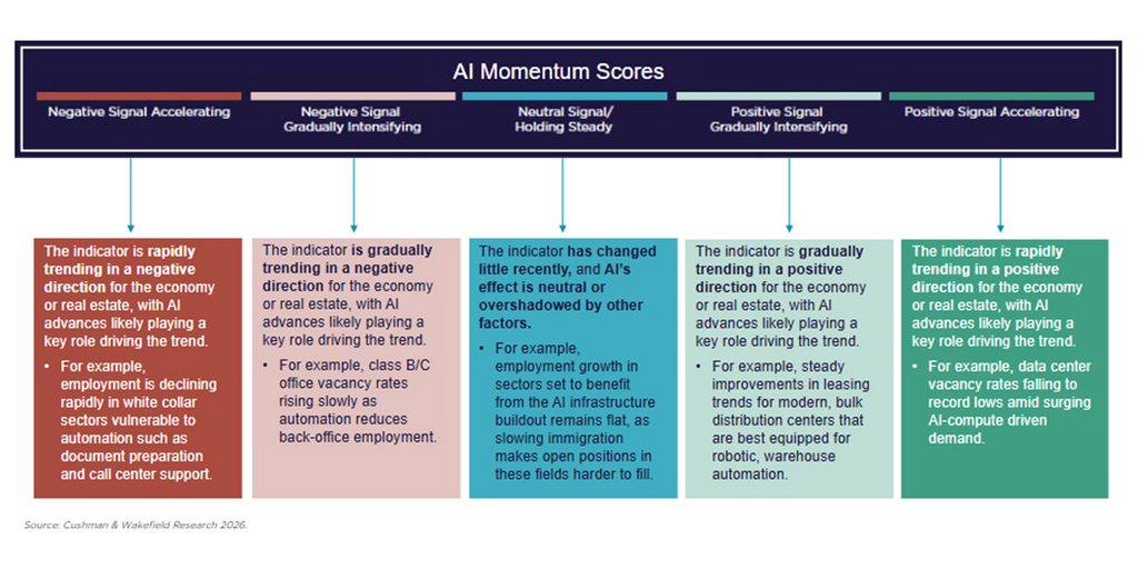 Rather than focusing on a single metric, the tool groups indicators into clear themes, such as AI adoption, capital investment, labor market shifts and infrastructure demand, and translates them into easy-to-interpret “AI momentum scores.” These scores are intended to show both the direction and the intensity of AI’s impact on different parts of the economy and the built environment.